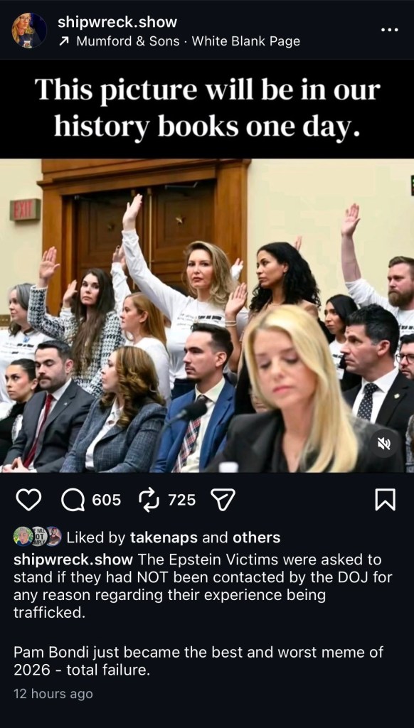 “Pam Bondi was not elected or appointed to protect predators, institutions, or power. Her only job is to serve the American people. Hiding the truth is not neutrality – it’s complicity. and history has never been kind to those who chose silence over justice.”