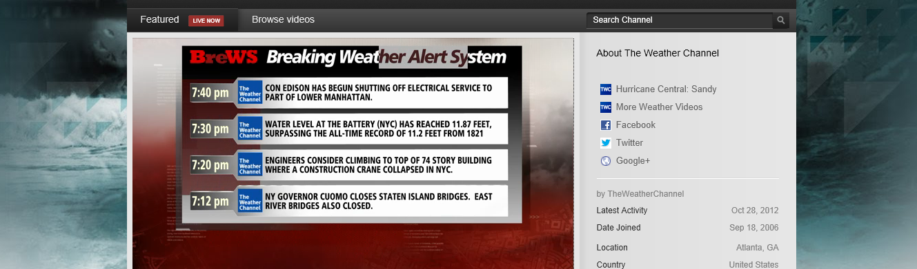 8:11 p.m. “Hurricane Sandy’s Devastation Imminent”– who told that person the headline was calming and informative? Talk about raising panic. Battery Park is flooding. The Weather Channel is still super excited about the tide, as if they want it to be worse than Irene. They say the East Village is flooded up to E. 14th Street. That means flooding might reach Union Square and Gandhi… Lights are flickering…