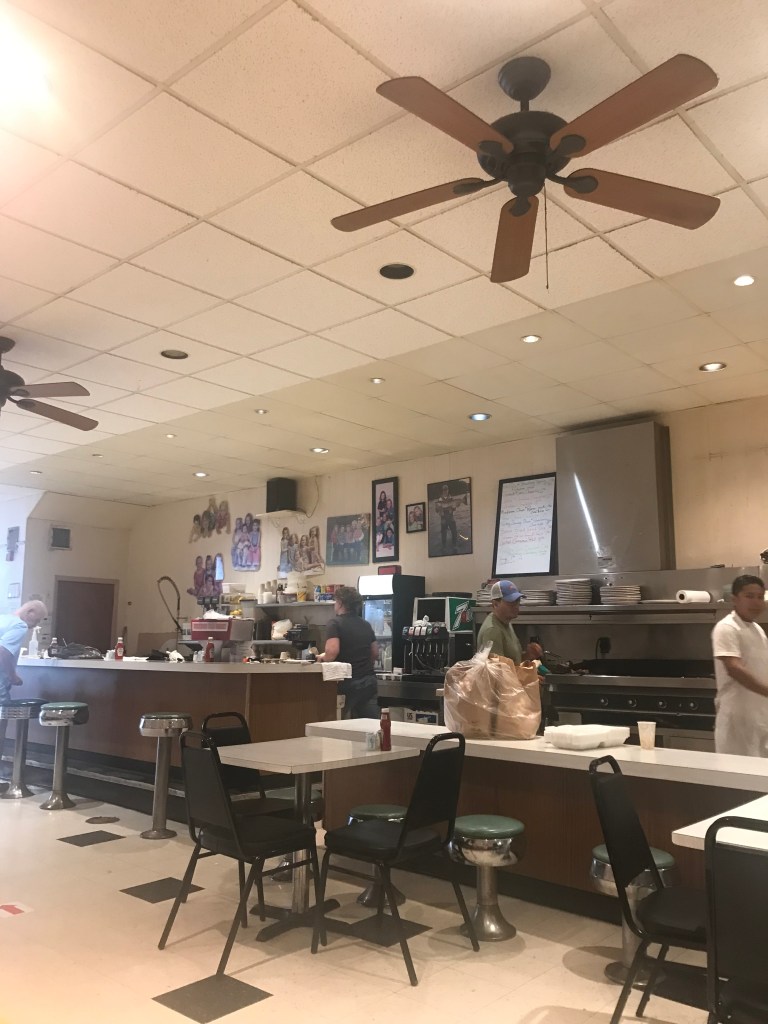 Naturally, when we got there, we were hungry. I am always hungry like a little caterpillar. We saw this cute diner looking place and went in. Everyone here knows each other. The kitchen is right there in the open, so you see your food as it is being prepared. And the prices… you can’t beat those prices. Tip: Check the specials board on the wall. Also, check out the children cutout portraits behind the counter. Unique.