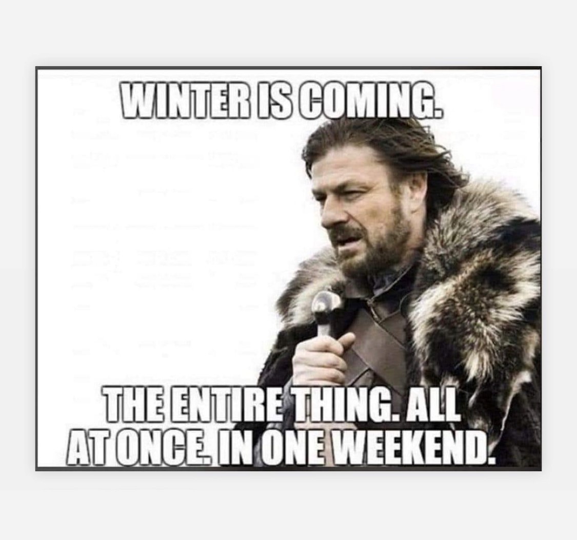“Winter is coming. The entire thing. All at once. In one weekend.”