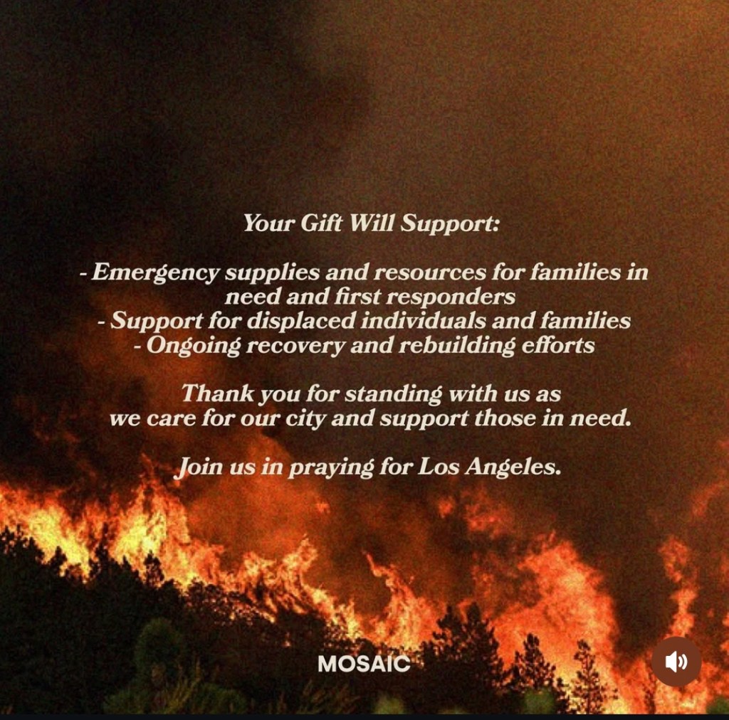If you are alone or vulnerable. If you need help, churches are on the ground and not leaving the area. Mosaic is one of those churches that is in Hollywood, Pasadena and active.