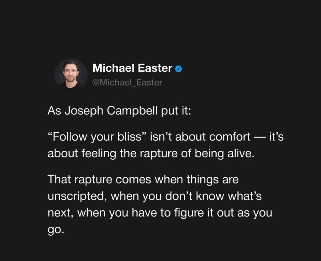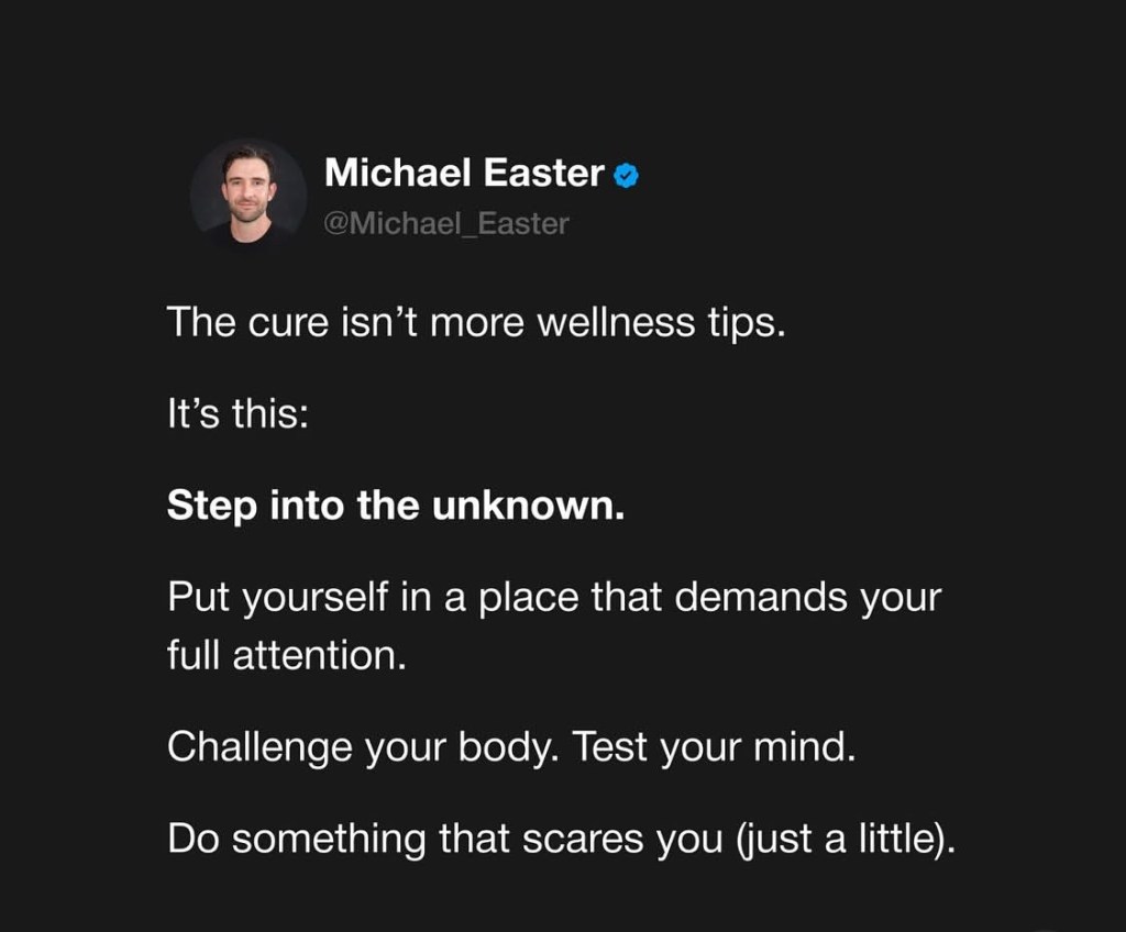 Adventure is the Fix Posted byGabriela Yareliz07/02/2025Posted inBeing Human, health, hope, philosophyTags:adventure, adventures, Life, Michael Easter I loved the words from Michael Easter below. Share this: Click to share on Facebook (Opens in new window) Facebook Click to share on X (Opens in new window) X Like Loading... Published by Gabriela Yareliz Gabriela is a writer, editor and attorney. She loves the art of storytelling, and she is based in NYC. View more posts