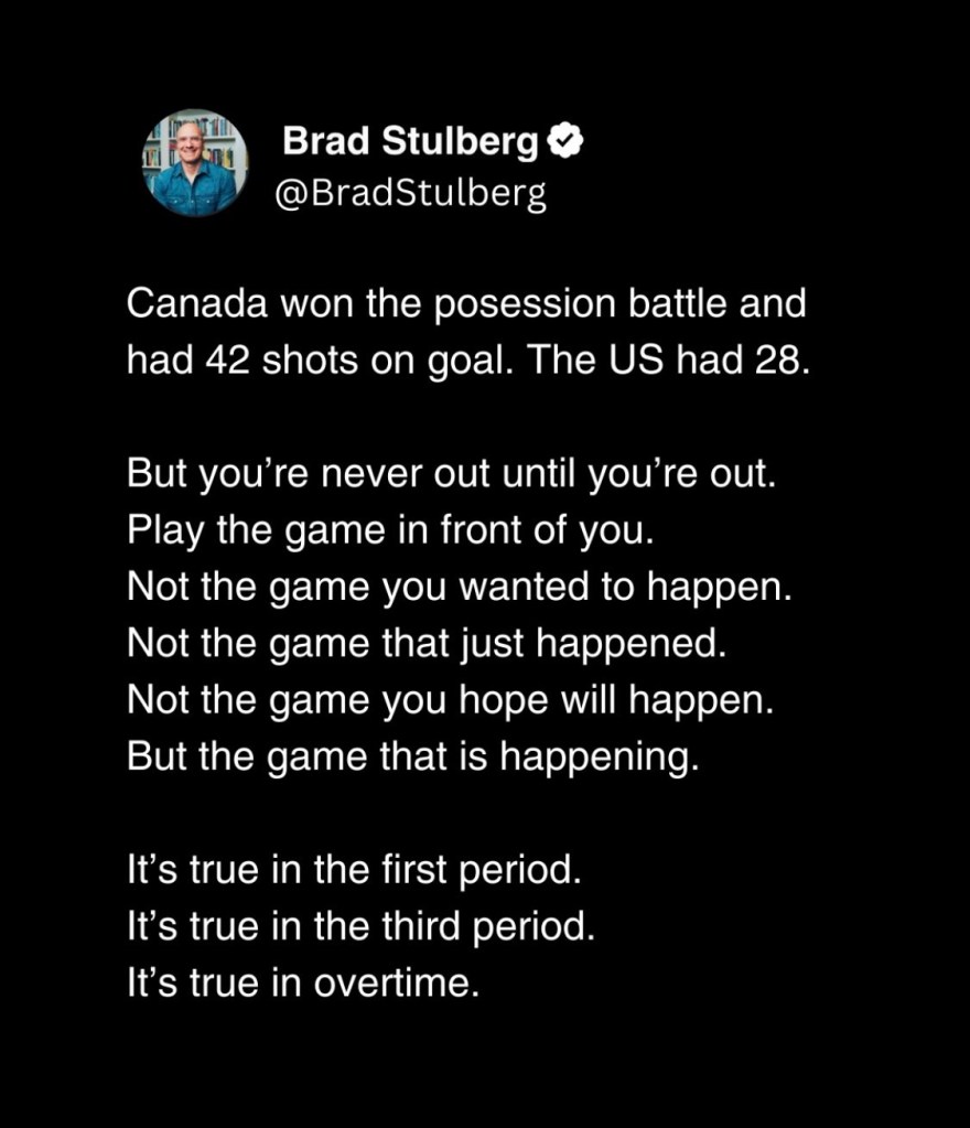 Team USA! Posted byGabriela Yareliz02/22/2026Posted inAmerican Wealth, culture, sports, UncategorizedTags:Brad Stulberg, hockey, inspiration, menโs hockey, olympics, team USA, the way of excellence Via @ikonick Grind it out like team USA. ๐บ๐ธ Share this: Share on Facebook (Opens in new window) Facebook Share on X (Opens in new window) X Like Loading... Published by Gabriela Yareliz Gabriela is a writer, editor and attorney. She loves the art of storytelling, and she is based in NYC. View more posts