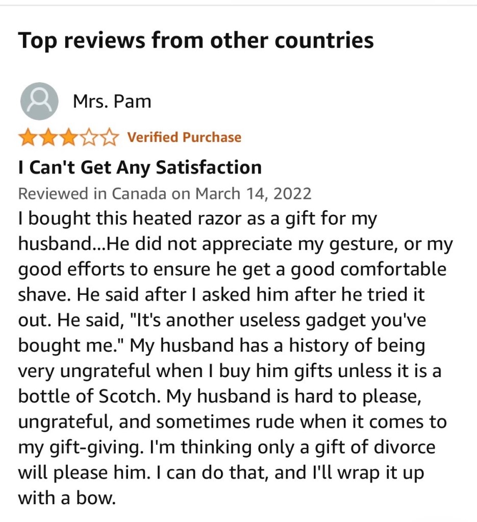 This sad review comes from Mrs. Pam, and it’s about a heated razor. But it’s also about more, you know? It’s about relationships, disappointment and self-worth.